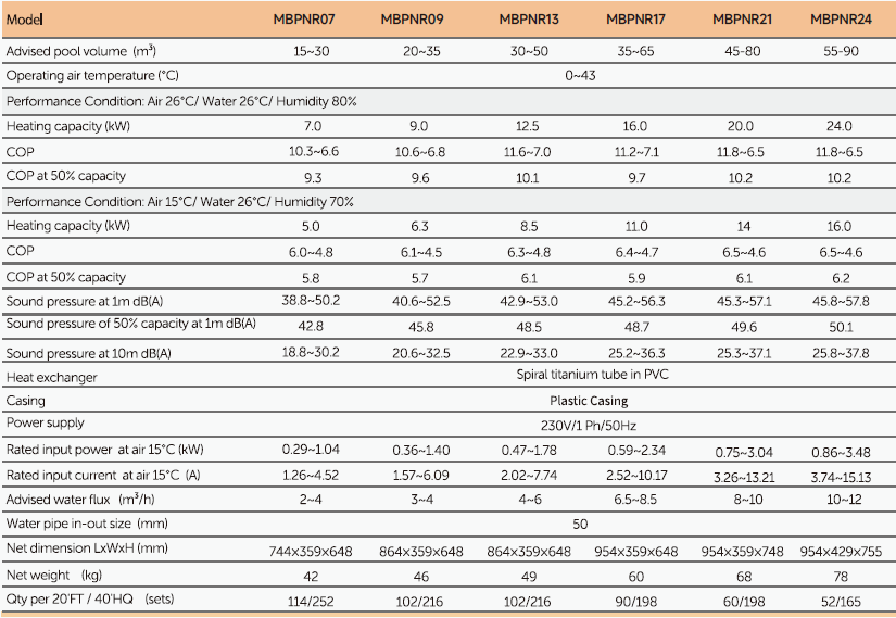 - Échangeur thermique en titane spiralé, compatible avec l’eau chlorée et salée.